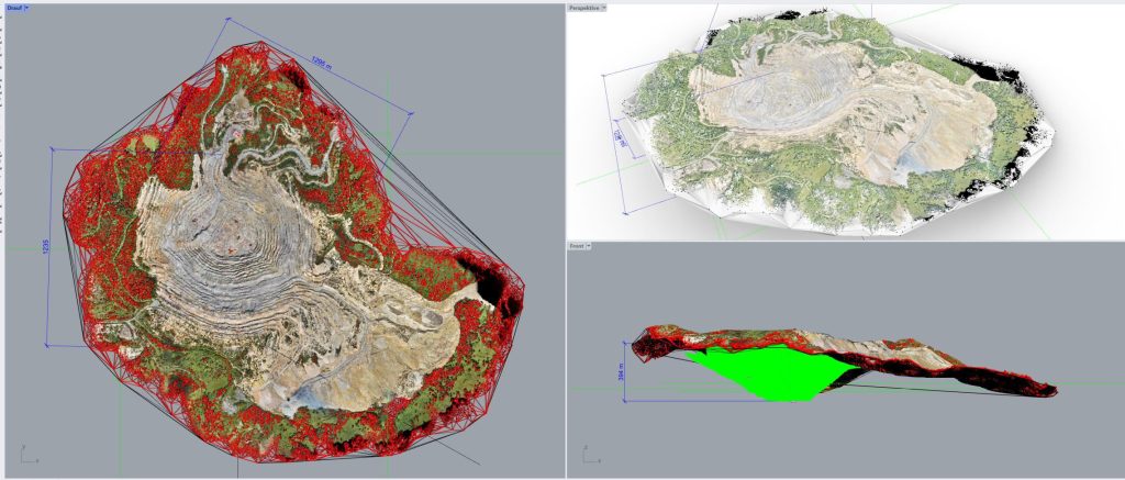 One striking example is the creation of a triangulated surface model of the Roșia Poieni pit containing 1.4 billion points. From this, a cross-section with over 3,000 points was generated and exported into FLAC3D, allowing the team to reconstruct the true geometry of mine benches before drone flights were conducted.