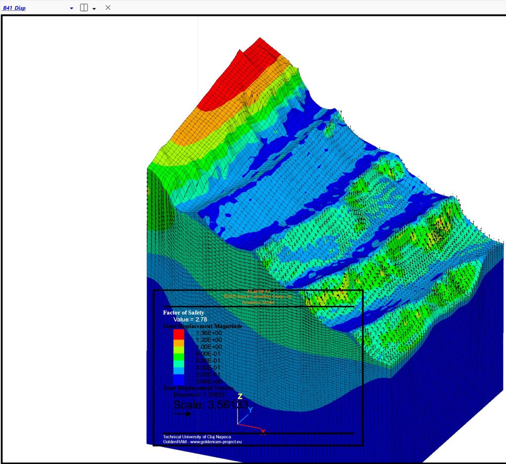 Through advanced numerical modelling in FLAC3D, the GoldenRAM team can simulate how stresses redistribute during excavation, anticipate failure mechanisms such as sliding or toppling, and track progressive deformations that may evolve into landslides. These predictive insights allow engineers to adapt strategies proactively rather than respond after an incident occurs.