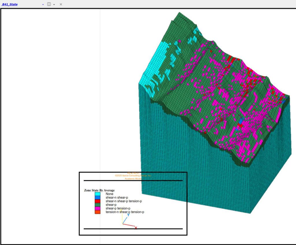 How FLAC3D visualises slope instabilities: example of zone state for B41
